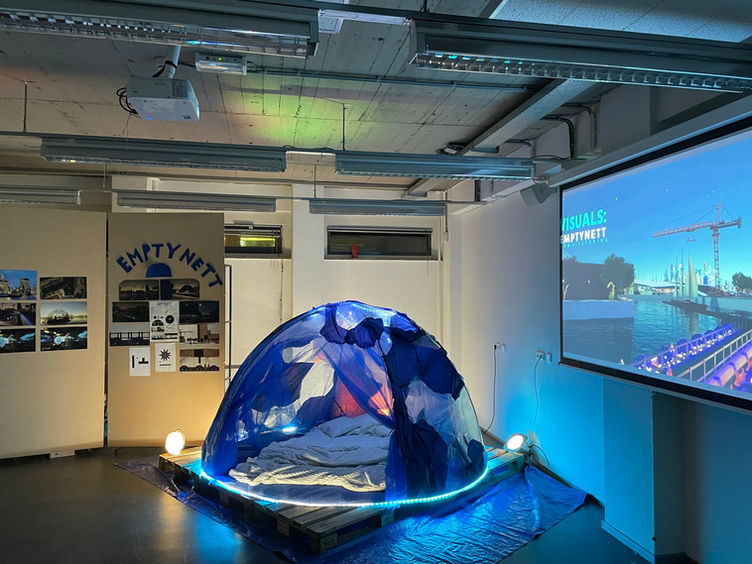 This project was in collaboration with the MoMo Festival of Art and Music in Rotterdam. The assignment for our group was to create a sleeping place, which could be easily reinstalled and would have a connection with Rotterdam City. Our group choice was to create floating domes in one of the oldest harbors of the Netherlands and cover them with reusable materials of marine - nets and plastic wraps. This emphasized Rotterdam as one of the biggest harbors in Europe and tried to propose a reusable attitude to materials.